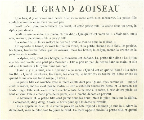 Cette voix si particulière, je l’avais rencontrée dans le roman de Aziz Chouaki, Baya, La Rhapsodie algéroise, publié en 2019 (éditions Bleu Autour) mais je ne l’avais pas reconnue, n’ayant pas encore rencontré l’histoire de Baya. Aziz Chouaki n’est malheureusement plus parmi nous et nous ne pourrons pas lui demander quand et comment il avait découvert Le grand zoiseau. Pour ne pas qu’on oublie Baya la conteuse ou Chouaki l’inspiré, le grand zoiseau est reproduit ici.
