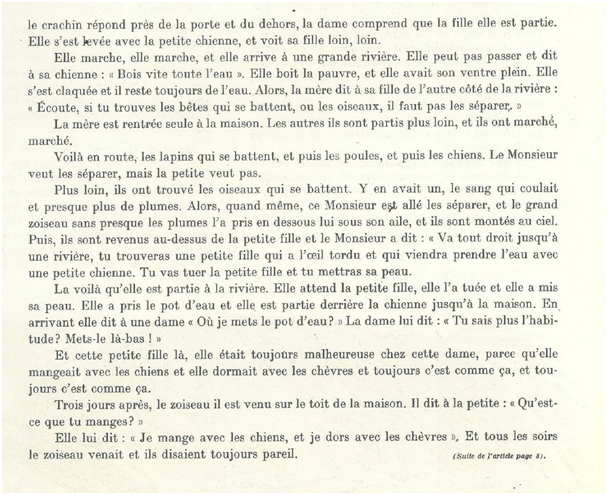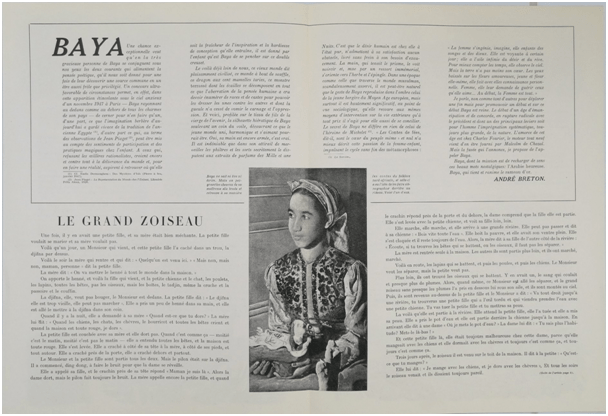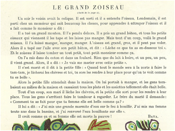 Cette histoire, aussi courte que magique, intitulée Le grand zoiseau se trouve parmi les huit pages de ce livret précieux qui fut conçu par Maeght pour annoncer l’exposition sous le titre ‘Derrière le miroir’, et pour célébrer la découverte d’une vision qui allait éventuellement même bouleverser Picasso. Chacune des huit pages est illustrée avec un dessin de Baya en lithographie, et c’est aux pages 4, 5, et 8 que Le Grand Zoiseau est imprimé.