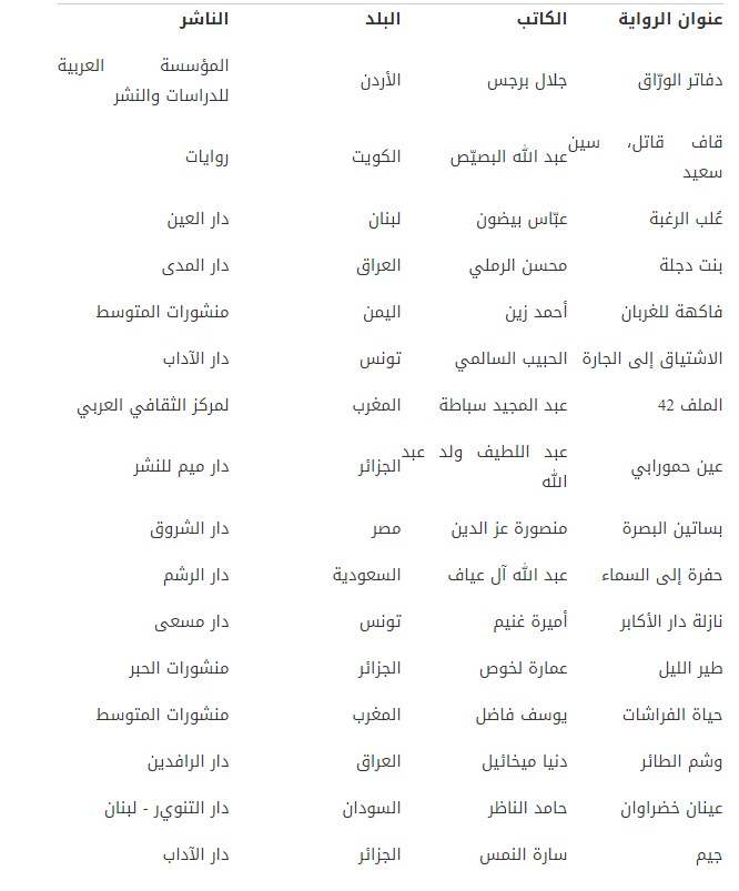 Trois auteurs algériens figurent sur cette long-list. Il s’agit d’Amara Lakhous pour son roman « Tayr el-Layl » (éditions El Mutawassit/éditions Hibr), Abdulatif Ould Abdullah pour son œuvre « ‘Ayn Hammourabi » (éditions MIM), et Sara Nems pour son texte « Jim » (Dar el Adab).