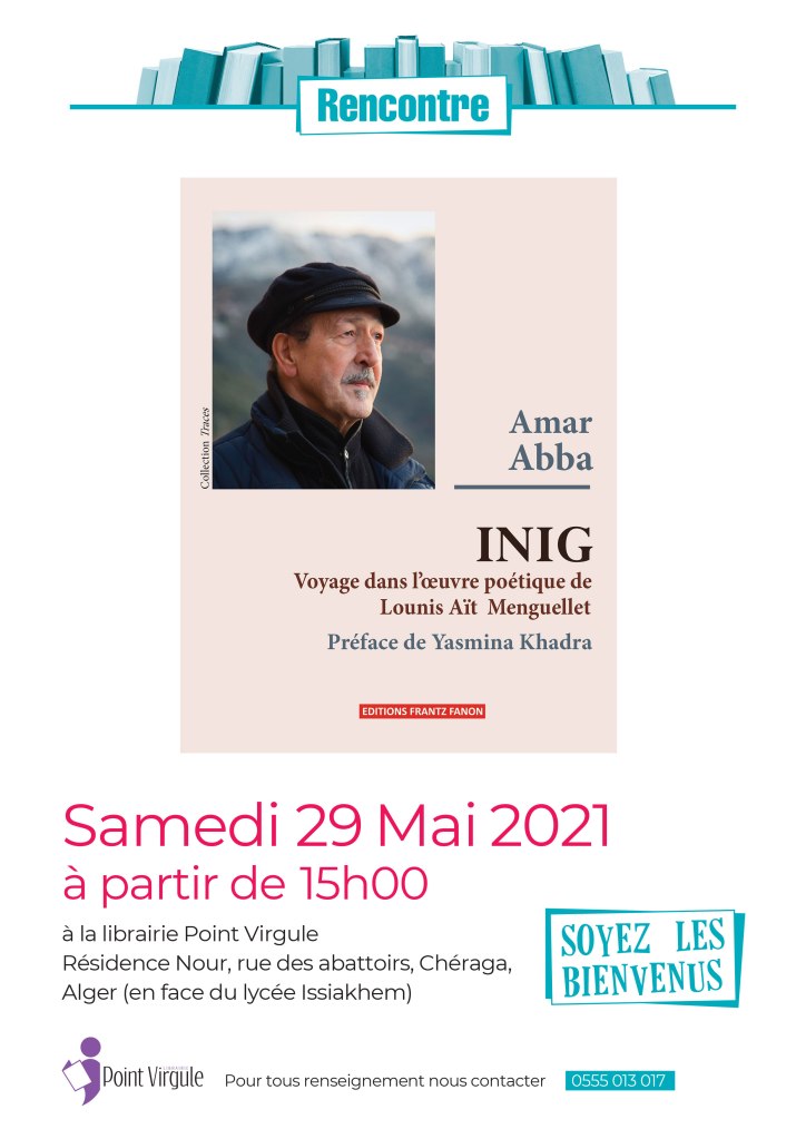 Une rencontre dédicace aura lieu le samedi 29 mai 2021 à partir de 15h à la Librairie Point-Virgule de Chéraga (Résidence Nour, rue des Abattoirs, Chéraga, Alger. En face du lycée Issiakhem). Elle sera animée par Amar ABBA, autour de son ouvrage « INIG, Voyage dans l’œuvre poétique de Lounis Aït Menguellet », paru aux éditions Frantz-Fanon, et préfacé par l’écrivain Yasmina Khadra. La Librairie précise que les places sont limitées et que les personnes souhaitant assister à la rencontre doivent confirmer leur présence, en appelant le : 0555 013 017.
