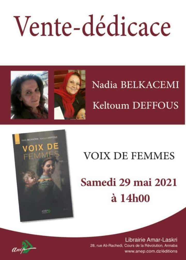 Les poétesses Nadia Belkacemi et Keltoum Deffous dédicaceront leur ouvrage « Voix de femmes » (éditions ANEP), le samedi 29 mai 2021 à partir de 14h à la Librairie Amar-Laskri (28, rue Ali Rachedi, Cours de la Révolution, Annaba).