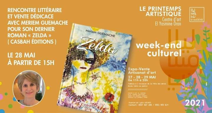Rencontre littéraire avec la journaliste et écrivaine Meriem Guemache, autour de son roman « Zelda » (éditions Casbah), le vendredi 28 mai 2021 à partir de 15h au Centre d’art El Yasmine (67, avenue Capitaine Hamri, Seddikia, ex-Courbet, Oran).
