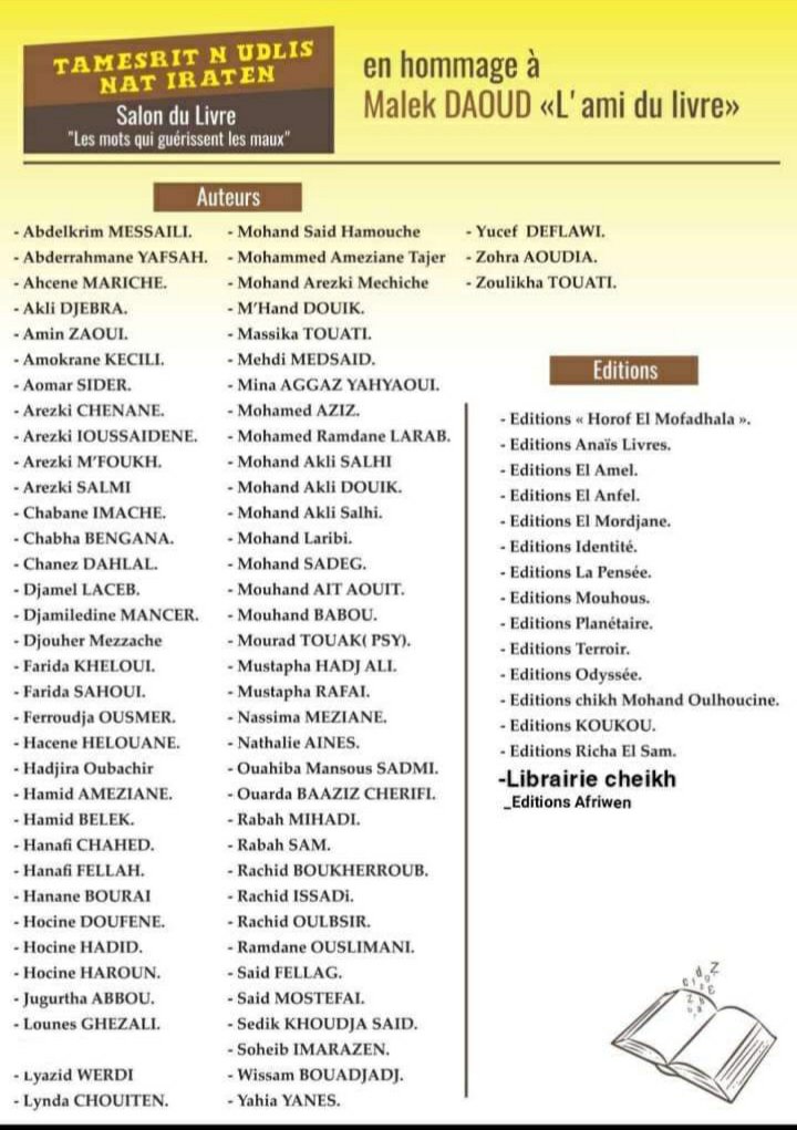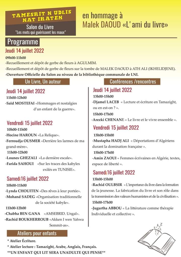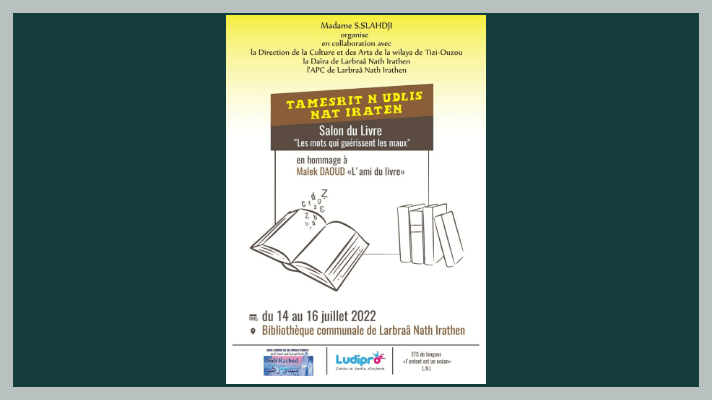 Du 14 au 16 juillet 2022, la Bibliothèque communale de Larbaâ Nath Irathen abritera un salon du livre, sous le thème « Les mots qui guérissent les maux », et en hommage à Malek Daoud « l’ami du livre ».