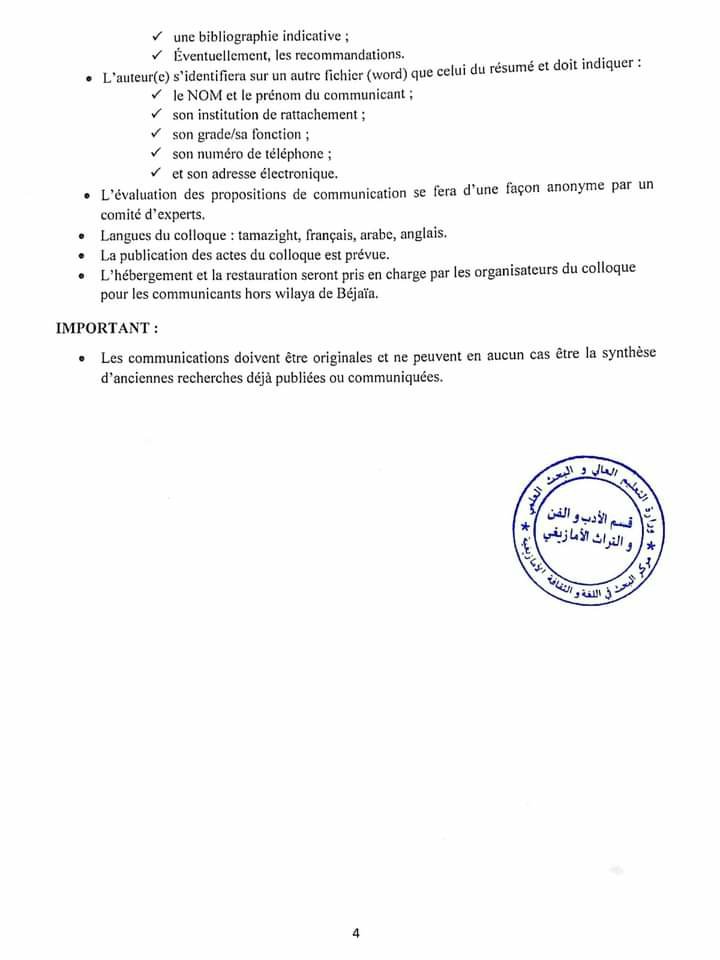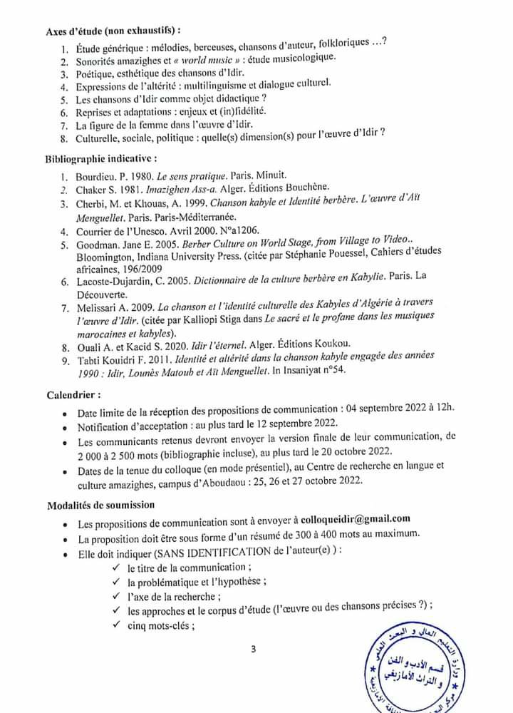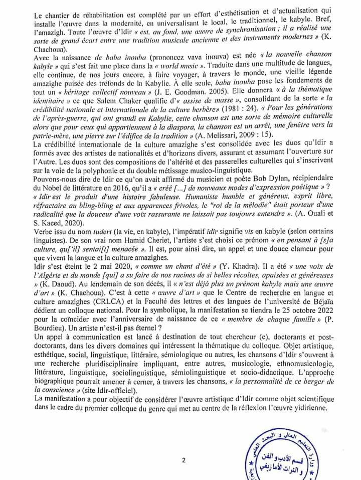 Le Centre de recherche en langue et culture amazighe (CRLCA) et la Faculté des Lettres et des Langues de l’Université de Béjaïa organisent, du 25 au 27 octobre 2022 au CRLCA -Campus d’Aboudaou (en présentiel), un colloque national sur le grand artiste feu IDIR, intitulé » IDIR: au-delà d’une voix, une ‘oeuvre d’art' ».