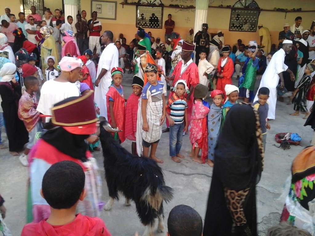 En attendant l’ultime lila, l’après-midi du dernier jour de la waâda est consacré au rituel Migzawa. Le groupe musical, muni de gangas (tbel) et de karkabous, se met dans un coin et commence à jouer un répertoire exclusivement réservé à cette cérémonie. Les hommes, les femmes et les enfants, portant des bouts de tissus bariolés appartenant à la zaouïa, participent à ce rituel et tournent autour d’un bouc et de deux lapins dans le sens inverse des aiguilles d’une montre. Lorsque Lemqedem utilise son hautbois traditionnel, le groupe change de rythme et les participants se mettent à danser. Une fois l’animal sacrifié, tout le monde quittera la cour afin de se rendre dans la pièce principale de la zaouïa pour prolonger la danse, qui se transformera en transe pour certaines personnes, notamment les femmes. Pendant le rituel, la Arifa, installée derrière un autel décoré de feuilles d’arbres et de foulards multicolores distribue un jus : un verre de «rouina» (farine de blé, utilisée et distribuée à l’assistance lors du bordj «Hamou»), mélangé à l’eau de fleur d’oranger contre une pièce de monnaie : «récolter la baraka» et «laisser une waâda» ! En outre, tout comme la mhalla (coffre contenant les accessoires nécessaires à la lila, comme les cravaches, les couteaux, les foulards de différentes couleurs, le jawi ou benjoin, le henné…) qui ne peut pas être montrée sur scène en raison de sa charge symbolique mais également de son inutilité dans un spectacle scénique, les sacrifices ne sont pas non plus très utiles pour un spectateur qui vient assister à un concert de musique. Mais tout de même, et comme nous l’affirmait Lemqedem âami Brahim de Béchar lors de notre rencontre avec lui, «on peut montrer certaines danses, certaines pratiques et les couleurs qui existent dans le Diwane, sans pour autant faire usage des instruments». Et justement, le rituel Migzawa est un spectacle à part entière, alliant musique et danse et invitant tous les présents à participer et à prendre part à la fête, qui gagnerait à être présenté au grand public. Certes, depuis deux ans, des groupes proposent des morceaux (avec les danses et les tenues) Migzawa au Festival national de la musique Diwane de Béchar, mais ces performances ne rendent pas vraiment compte de la beauté de ce rituel, qui instille de la joie de vivre dans le cœur et le corps de chacun des membres de l’assistance. Il serait peut-être pertinent de réfléchir sur l’espace et sur la manière de présenter et de mettre en scène ce rituel précis et le diwane de manière générale.