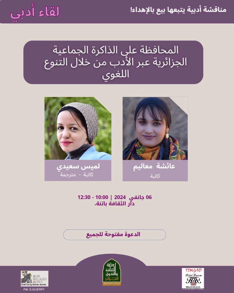 Comme il arrive souvent dans ce blog, je reçois aujourd’hui le journaliste et auteur et « chasseur d’images » du pays Chaoui, Rachid HAMATOU, qui nous fait le compte rendu d’une rencontre qui a eu lieu ce matin de samedi à la maison de la culture de Batna, et qui a eu pour thème l’oeuvre de Yamina Mechakra et la traduction de son roman Arris par la traductrice et autrice Lamis Saidi (éditions El Kalima, Octobre 2023); mais aussi la découverte de la plume de la jeune autrice Aicha Maalim.