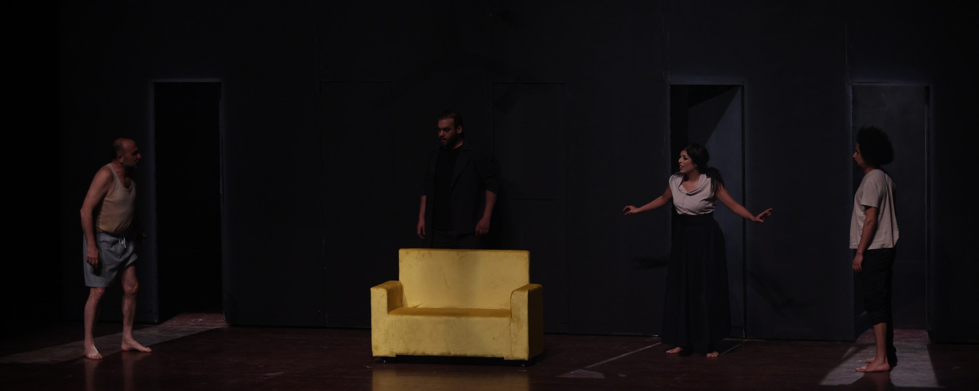 L’atmosphère de la pièce est lourde, parfois oppressante. Le décor, un mur sombre avec des ouvertures crée une sensation de monde clos et en déclin. Les personnages apparaissent et disparaissent à travers les ouvertures, symbolisant l’instabilité et la fuite d’une réalité en décomposition. La mise en scène a été enrichie par une projection vidéo en noir et blanc, accentuant le caractère dévasté de l’univers présenté. Cette projection accompagne le discours de la pièce en soulignant visuellement l’ampleur du désastre écologique et humain.